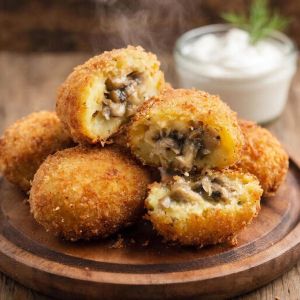Нежное картофельное пюре в хрустящей панировке скрывает внутри ароматную грибную начинку с луком