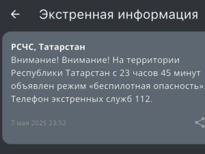 МЧС 7 мая в 23.45 объявило на территории Республики Татарстан угрозу атаки БПЛА.
