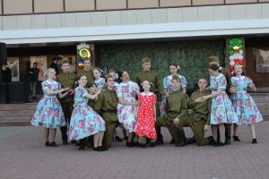 Мәктәп укучылары, сабый балалар строй җырларын, иҗади чыгышларны Бөек Җиңү юбилеена багышладылар.